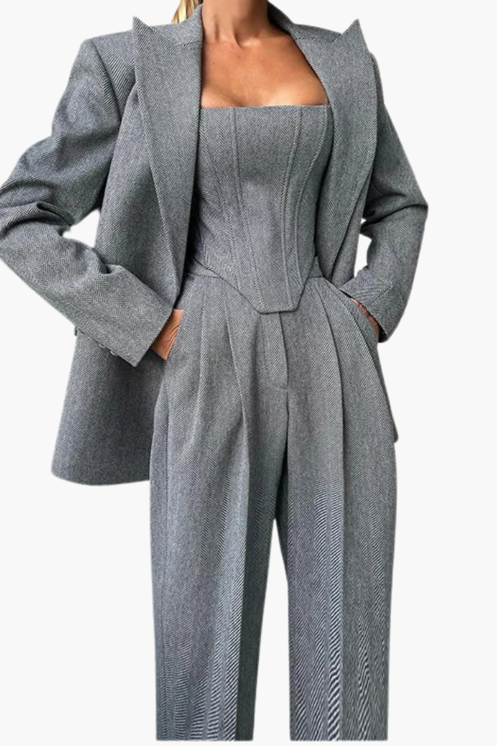 Náš nejoblíbenější třídílný komplet spojuje strukturu, rafinovanost a rozhodnou ženskost – navržený tak, aby zanechal dojem v každém prostředí.