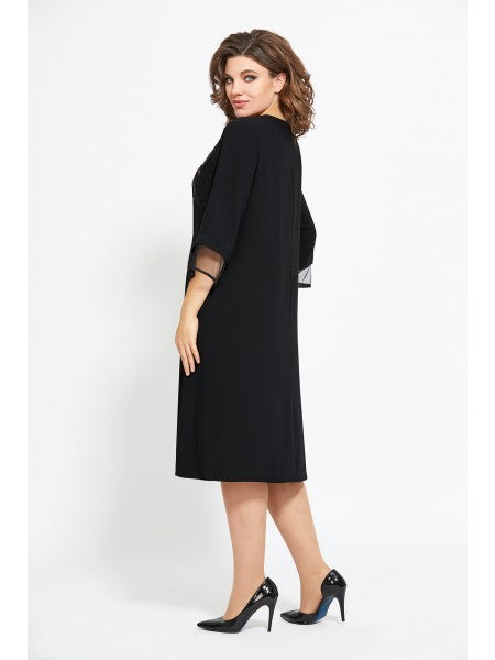 Rukávy ve 3/4 délce jsou zakončeny jemným průhledným lemem, který dodává šatům lehkost a moderní nádech. Ideální volba pro večerní akce, oslavy, rodinné události či společenské příležitosti.