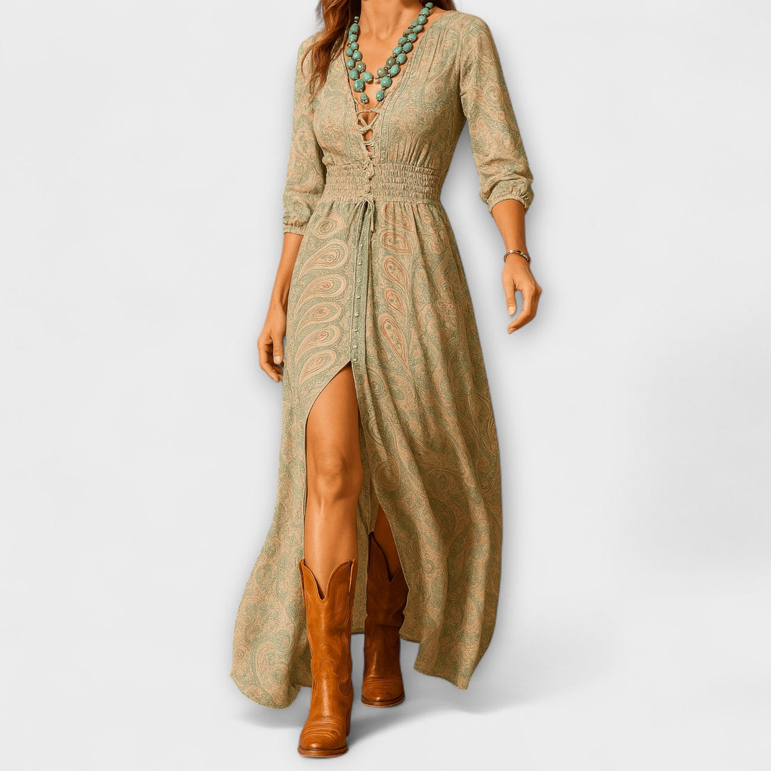 Regina | Maxi šaty s rozparkem vpředu a paisley vzorem