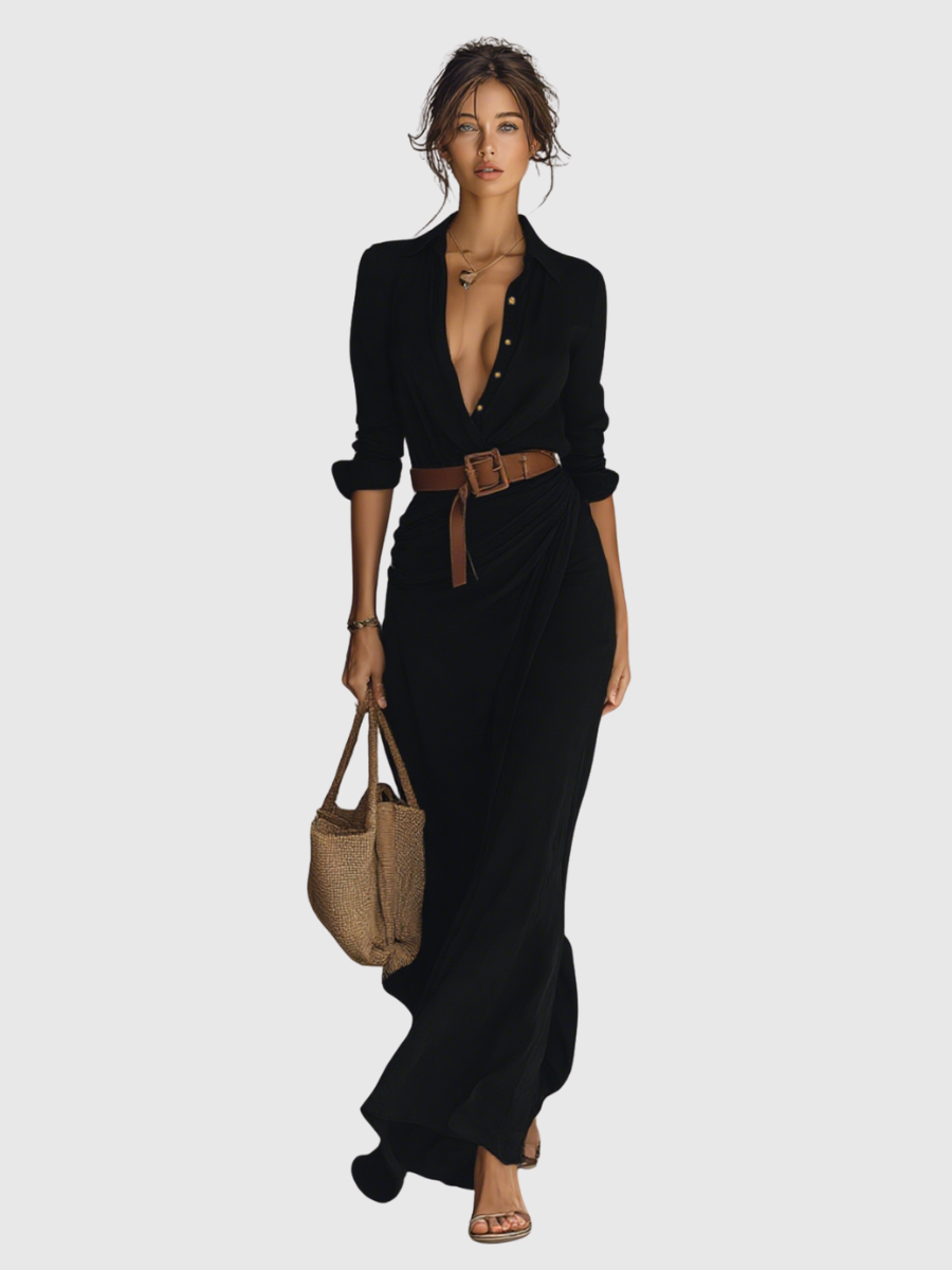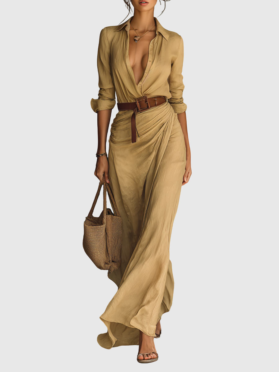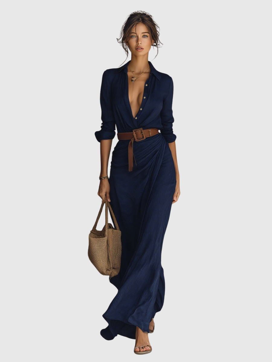 Elegantní dlouhé šaty charakterizované klasickým designem s límečkem, dlouhými rukávy a jednoduchým zapínáním na knoflíky. Pas s páskem zvýrazňuje vaši siluetu pro rafinovaný a ženský vzhled.