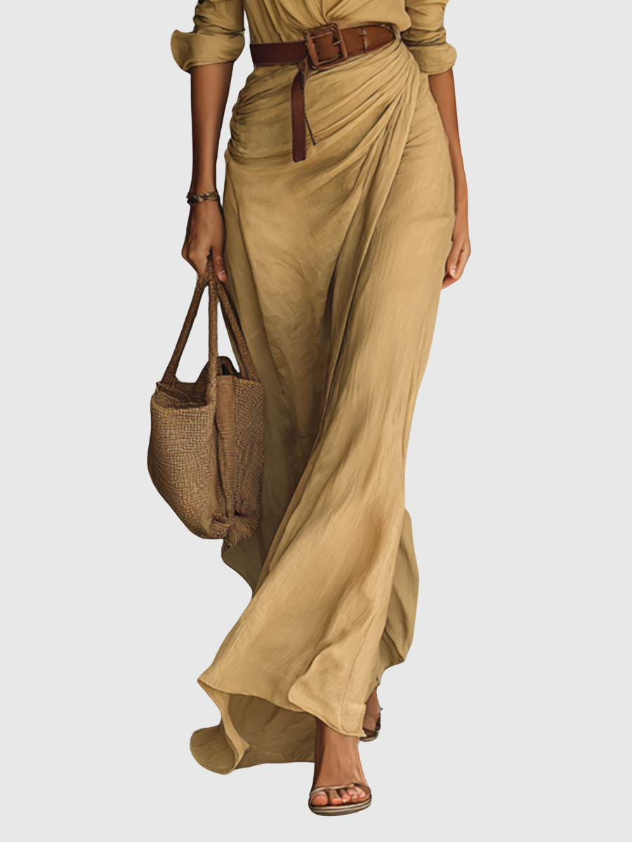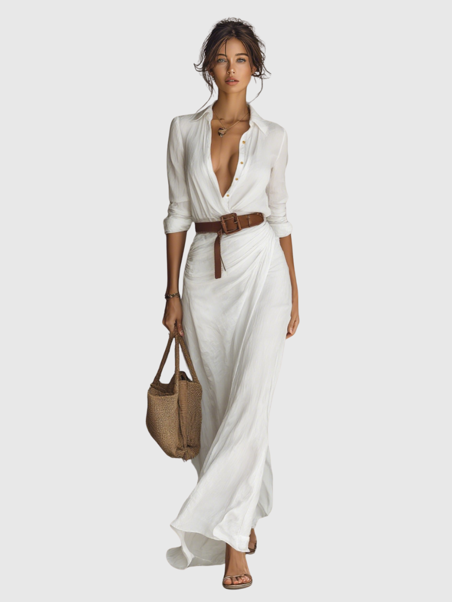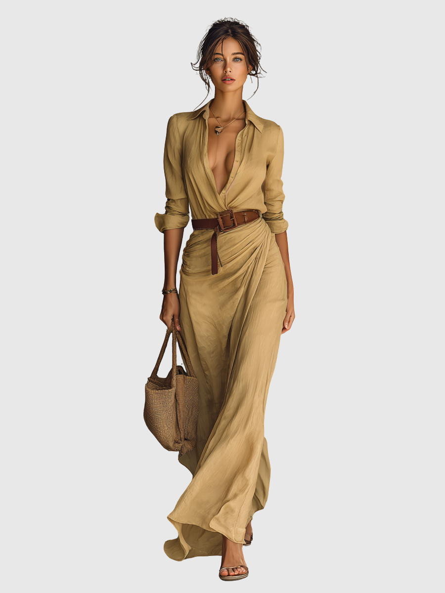 Elegantní dlouhé šaty charakterizované klasickým designem s límečkem, dlouhými rukávy a jednoduchým zapínáním na knoflíky. Pas s páskem zvýrazňuje vaši siluetu pro rafinovaný a ženský vzhled.