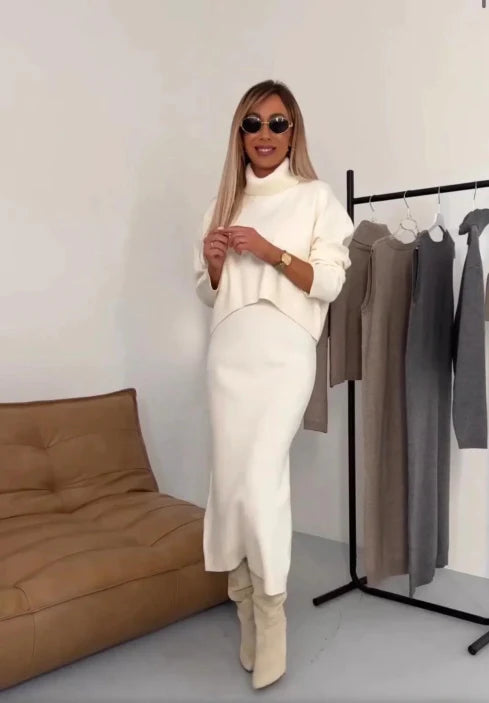 Úzká sukně zdůrazňuje tvary s třídou, zatímco oversize rolák dodává celku moderní charakter. To je ideální komplet pro ženy, které chtějí vypadat elegantně, ale cítit se pohodlně — od ranní kávy po večerní setkání.