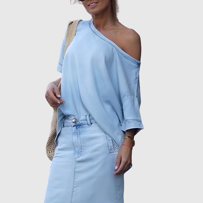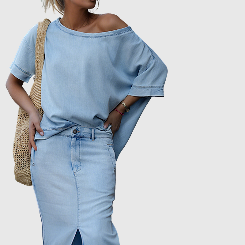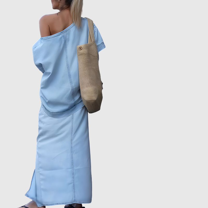 Venise | Dámský top s asymetrickými rameny a rozparkovou džínovou maxi sukní