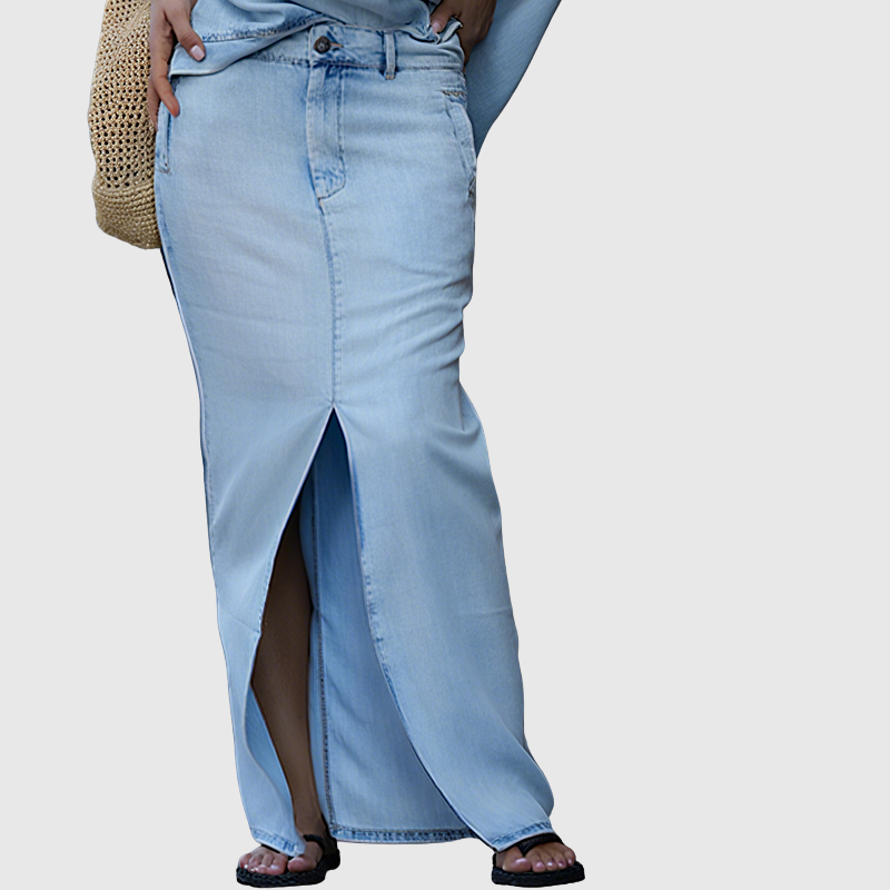 DŽÍNOVÁ SUKNĚ S ROZPARKEM VEPŘEDU – Pohybujte se s ladnou jistotou. Vysoký přední rozparek u dlouhé džínové sukně poskytuje větší volnost pohybu, aniž byste se musela vzdát pevné siluety či sofistikovaného vzhledu. Dokonale vyvažuje odvážný nádech a eleganci, takže kráčíte sebevědomě a zároveň si zachováte moderní a univerzální styl.